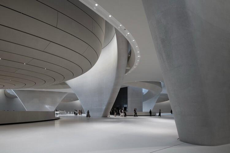Designed by Foster + Partners, the Zayed National Museum features five soaring steel structures inspired by falcon wings, symbolizing Sheikh Zayed’s passion for falconry and the Emirates’ rich heritage. These striking wings also function as passive cooling towers, combining advanced engineering with sustainable design principles. The building sits within a sculpted landscape mound, offering natural insulation and creating a harmonious connection between architecture and the surrounding environment.
